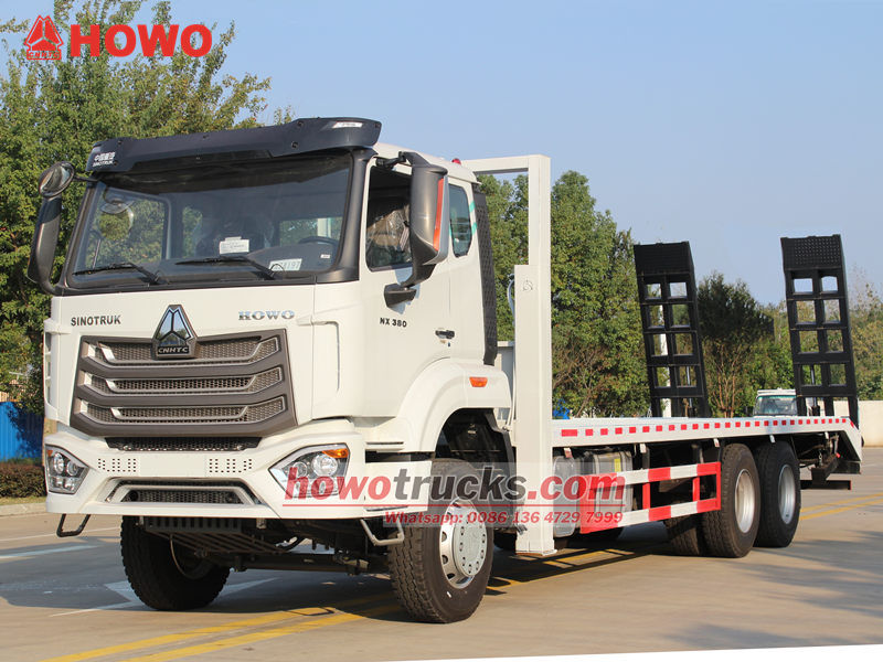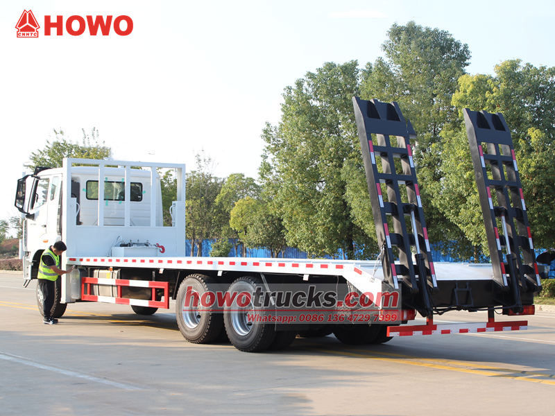 Těžký plošinový samonakládací vůz HOWO 6x4 je specializované vozidlo určené pro přepravu velkých strojů a zařízení, stavebních vozidel a neodnímatelného nákladu. Jeho nízká korba poskytuje dostatek ložného prostoru a vysokou nosnost, což snadno splňuje přepravní potřeby stavebních strojů, jako jsou bagry a buldozery.