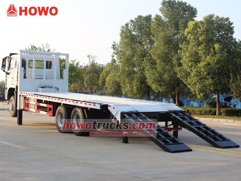 Samonakládací plošinový vůz Howo 6x4 se vyznačuje nízkoprofilovou konstrukcí s prostornou nakládací plošinou ve vhodné výšce, což efektivně snižuje nakládací a vykládací sklony a usnadňuje nakládání a vykládání stavebních strojů a velkých zařízení. Robustní podvozek a vysoká nosnost vozidla snadno splňují přepravní potřeby těžkých strojů, jako jsou bagry, buldozery a silniční válce. Materiál plošiny je navíc vyztužen a ošetřen protiskluzovou úpravou, což zvyšuje jak nosnost, tak stabilitu a bezpečnost během přepravy.