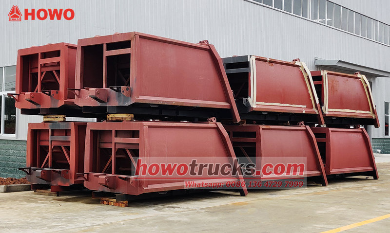 Nástavba pro hutnění popelářského vozu Howo 8cbm (nazývaná také horní část karoserie hutňovače se zadním nakladačem, sada horní části karoserie hutňovače odpadu 8cbm, nástavba hutňovače odpadu, sada horní části karoserie hutňovače odpadu, sada pro svoz odpadu se zadním nakladačem atd.) Horní část těla je popelnice o objemu 8 kubických metrů, vzadu je mechanismus naklápění kbelíku, existují 3 způsoby ovládání nakládky a vykládky nákladního vozu.