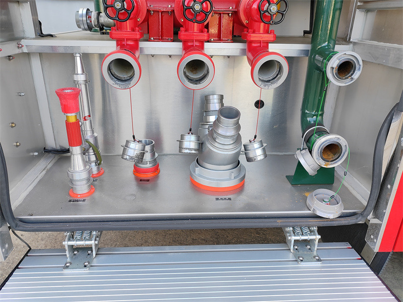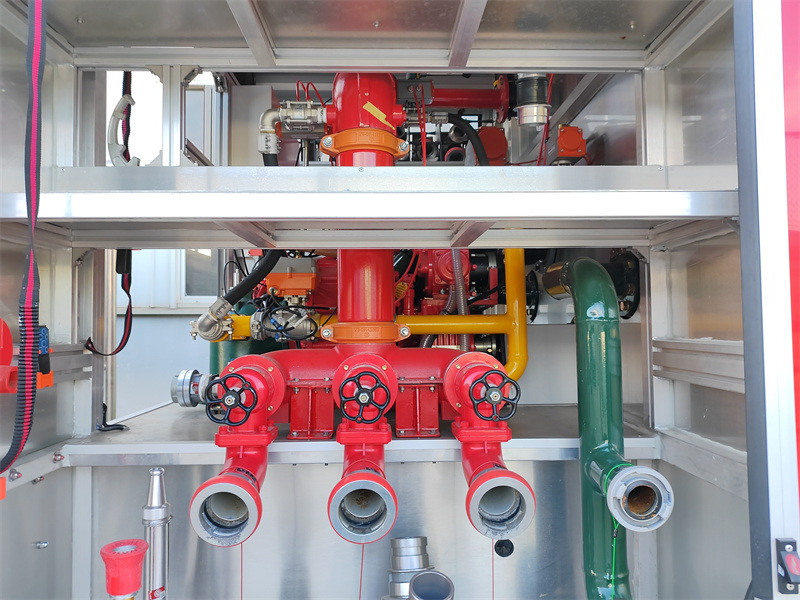 ● Vozidlo je také vybaveno rozdělovačem a sběračem vody, což umožňuje flexibilní přepínání zdrojů vody a vícekanálovou dodávku vody, čímž se zlepšují trvalé hasicí schopnosti a přizpůsobuje se požadavkům složitých požárních scén.