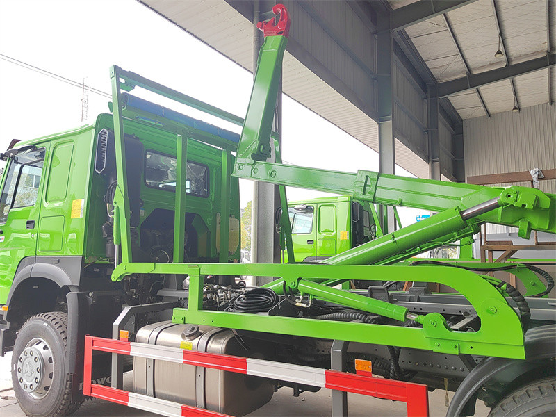 Equipped PALFINGER hooklift unit,sheeting SystemTen/Ta/To HOWO Hákový nakladač s plachtovým systémem je těžký popelářský vůz s hákovým nosičem odpadu postavený na podvozku těžkého nákladního vozidla HOWO 8x4, speciálně navržený pro velkoobjemovou přepravu pevného odpadu. Jeho hlavní výhodou je integrace systému hákového nosiče odpadu Palfinger T26 a inovativní technologie automatické plachty „teleskopický hrábě“. Vozidlo se pyšní výkonnou nosností 26 tun a dokáže hydraulicky pohánět plachtu, aby se kontejner na odpad během celého procesu automaticky utěsnil, čímž účinně zabraňuje rozlití a prachu během přepravy. Unikátní konstrukce bezpečnostního blokování zajišťuje, že systémy hákového nosiče a plachty nemohou fungovat současně, čímž se zásadně zabraňuje rušení a poškození zařízení a zaručuje se provozní bezpečnost. Je vybaven vyspělým, originálním systémem plachty kompatibilním se všemi zařízeními pro nakládku a vykládku s hákovým nosičem odpadu na trhu. Dosahuje efektivního a ekologického provozu v celém procesu od nakládky, vykládky a přepravy až po utěsnění, což z něj činí výkonný těžký nástroj pro moderní městskou sanitaci.