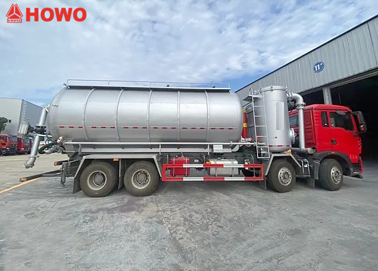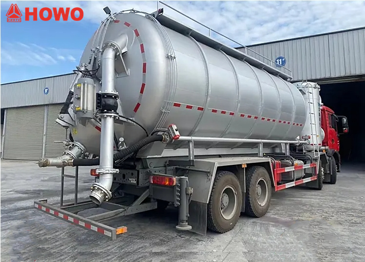 Dopravníkové vozidlo HOWO 8x4 s objemem 25 cbm, upravené na podvozku HOWO TX350 8x4, s velkým rozvorem 1800 + 4600 + 1350 mm, vybavené motorem Sinotruk MC07H.35-60 a převodovkou HW15710L. Horní část karoserie je plně vybavena kapsovými filtry a zadní část je skladovací nádrží. Je vybaveno hydraulickými výsuvnými podpěrami, ventilátory, potrubím pro vnější přívod vzduchu, vývěvami, vzduchovými kompresory, zvedacími válci, filtračními systémy, sacím a výtlačným potrubím, elektronickými ovládacími skříněmi atd. Vývěva má podtlak na sání a vzduchový kompresor má přetlak na výtlaku.
