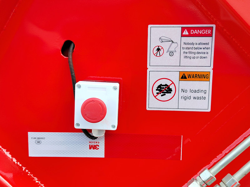 ►Speciálně navržené tlačítko nouzové brzdy umožňuje zastavení mechanismu lisování odpadu v jakémkoli stavu nebo poloze, což zajišťuje bezpečnost personálu a zařízení.