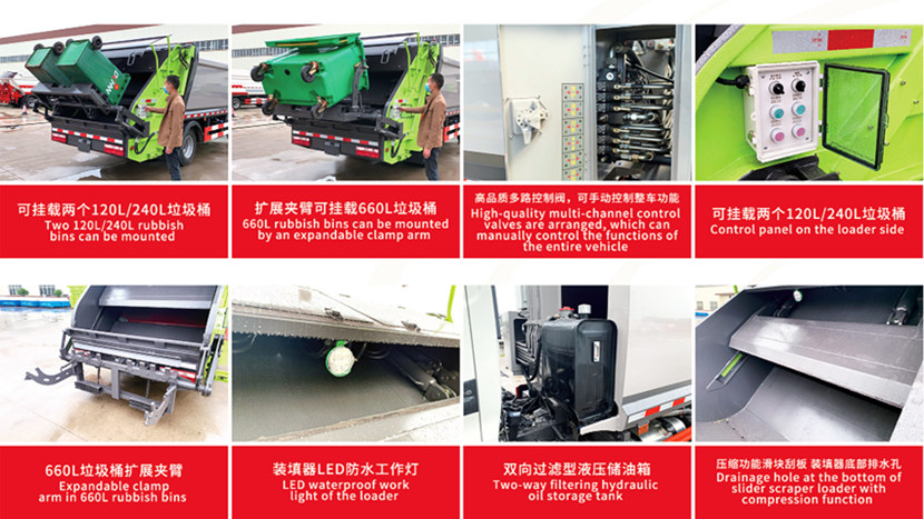 ●Snadná obsluha: Automatické nakládací zařízení v zadní části dokáže rychle zvednout, rozdrtit a zhutnit odpad, což šetří čas a práci.