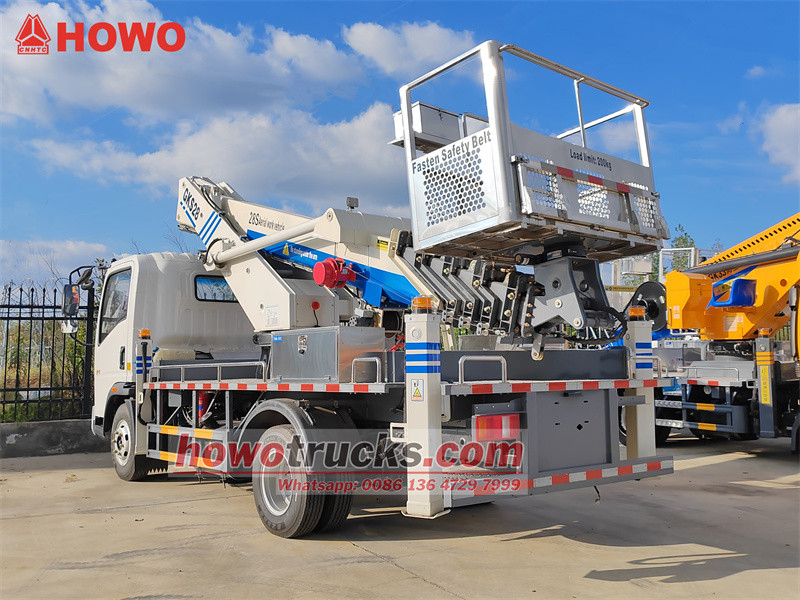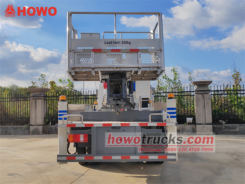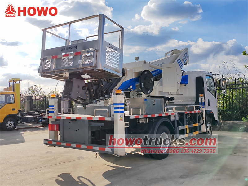 Tato pracovní plošina Sinotruk RHD je vybavena podvozkem lehkého nákladního vozu HOWO RHD s rozvorem 4500 mm. Je vybavena motorem Weichai WP2.3Q140E62 a převodovkou WLY6TS55. Horní část korby je vybavena 6dílným teleskopickým výložníkem ovládaným ze země a otočným stolem.ovládací skříňnebo dálkovým ovládáním. Může se otáčet o 360 stupňů, má čtyři hydraulické výložníky, maximální nosnost lopaty 200 kg, panely z hliníkové slitiny a vzorovaný protiskluzový chodník. Součástí jsou také noční provozní světla.